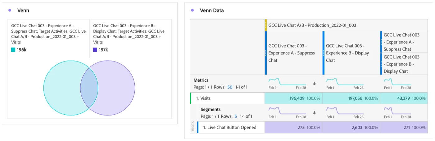 I have an A/B activity where I'm seeing traffic enter both experiences. What initially brought my attention to this was interaction with the chat widget (~10%) in the control variant -- Live Chat Button Opened. See Venn diagram and data below. This is unexpected because the widget is being suppressed in the control. In fact, there is no code that would deliver the widget here.