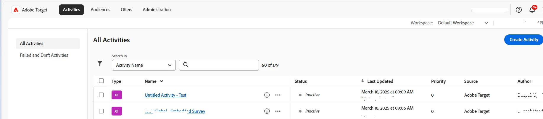 I have just observed that the activities created under local workspaces/properties are now displaying under the Default Workspace following the VEC revamps - 25.2.1 release (February 17, 2015). Kindly refer to below screenshot: