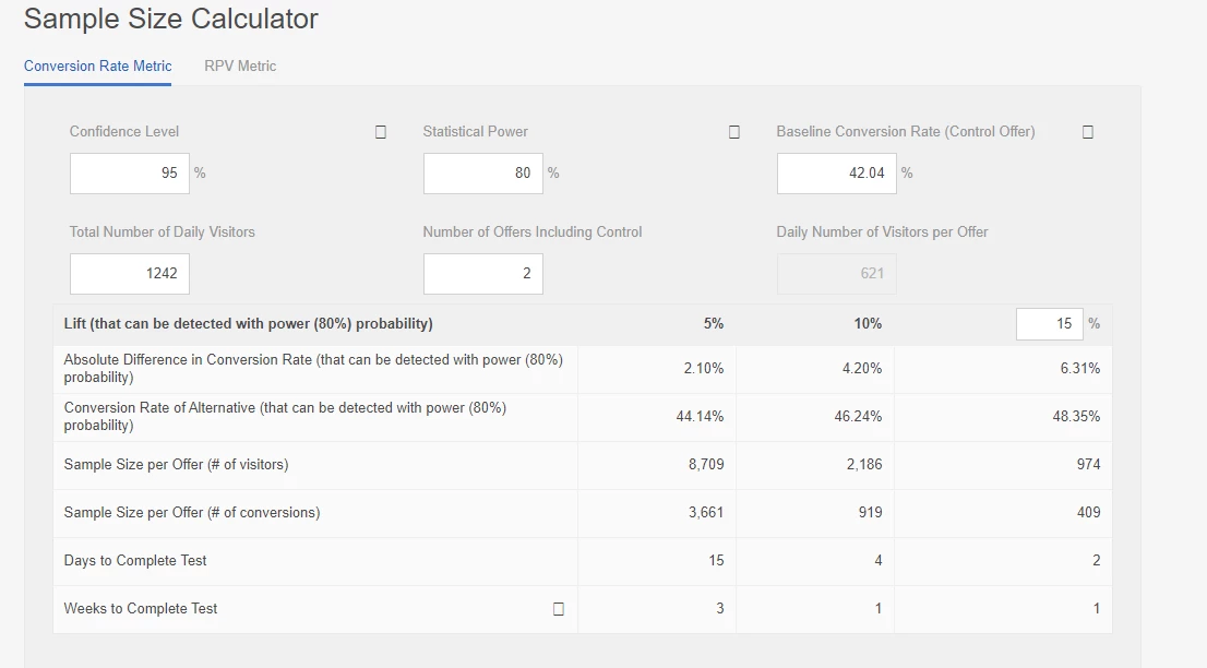 Hi, I am trying to understand the sample size calculator. As with the increase in the lift percentage, the no of days to complete the test is less. Example - if Lift is 15% then Days to complete test is 2 if daily visitors are 1242.