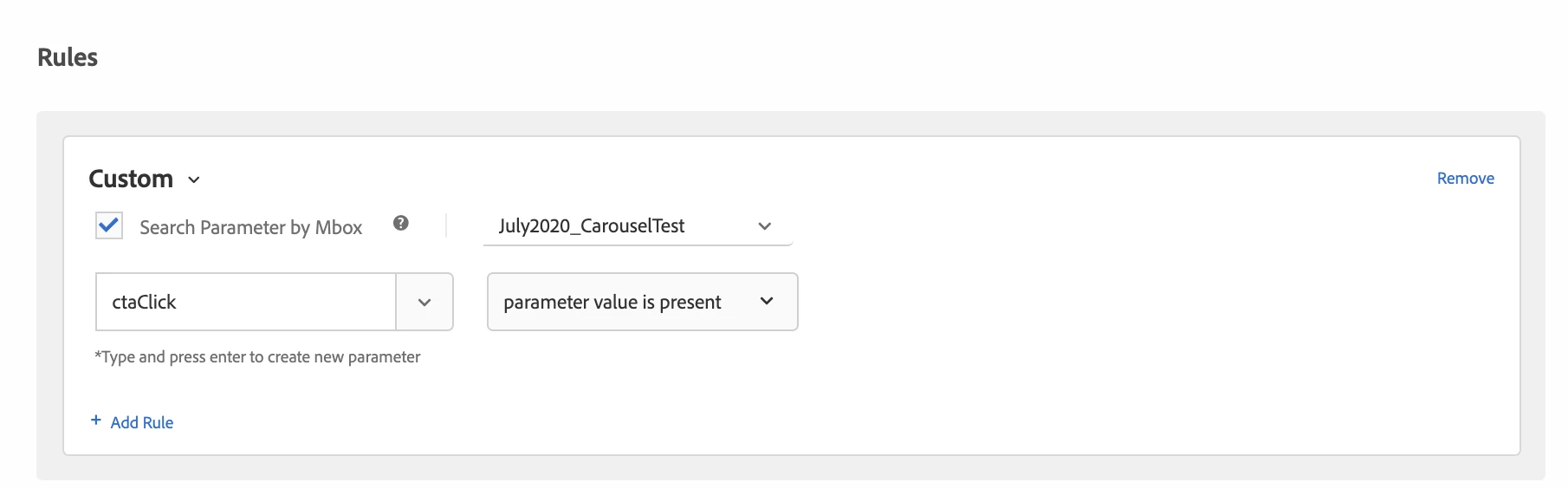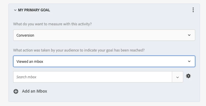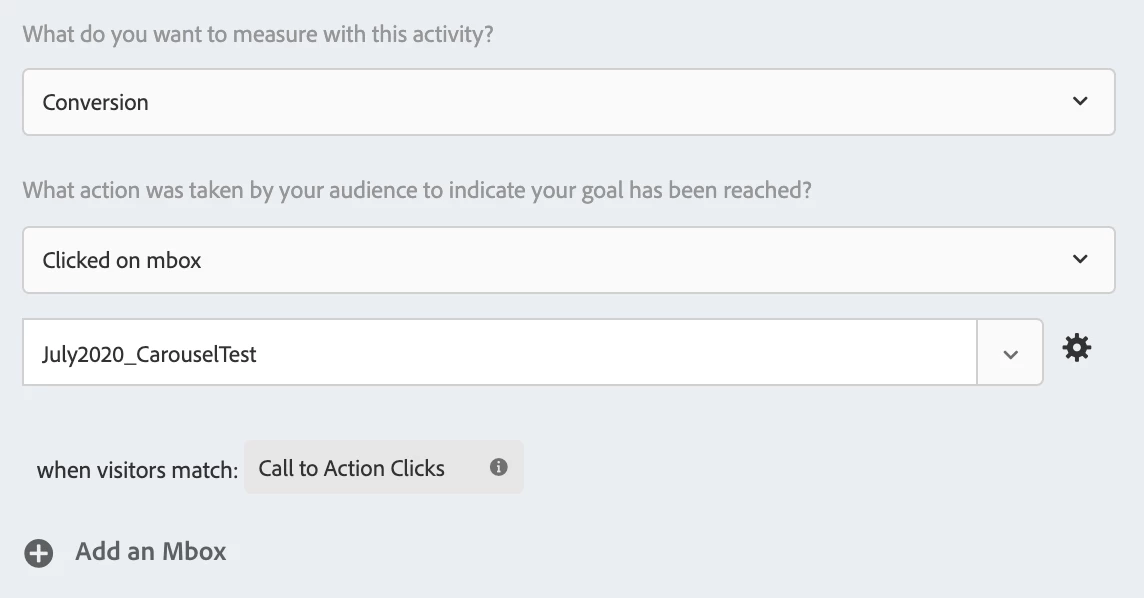 In my Target activity, I've created a a conversion metric targeting the mbox mentioned above. I have a refining audience requiring a value be present in the ctaClick parameter. See below for screenshots detailing this.