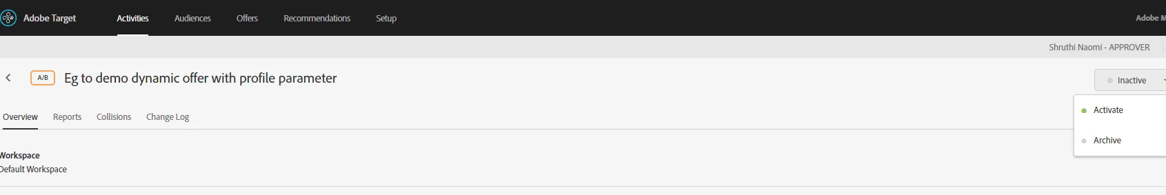 I am new to adobe target. I created an activity in adobe target. By default, its status is inactive. How can i publish this activity? I am not able to find an option to activate it. I am using 6.3 AEM.