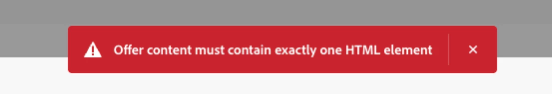 I tried creating an HTML Offer in Adobe Target, which contained HTML <div>...</div>, a style block <style>...</style>, as well as a script blocks <script>...</script>, but when I tried to insert the offer into an activity, it gave the following hard stop error message: "Offer content must contain exactly one HTML element".