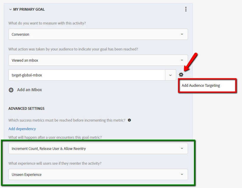 4. Add the audience as an additional Audience Targeting rule to the mbox in the conversion metric. See screen-shot below.