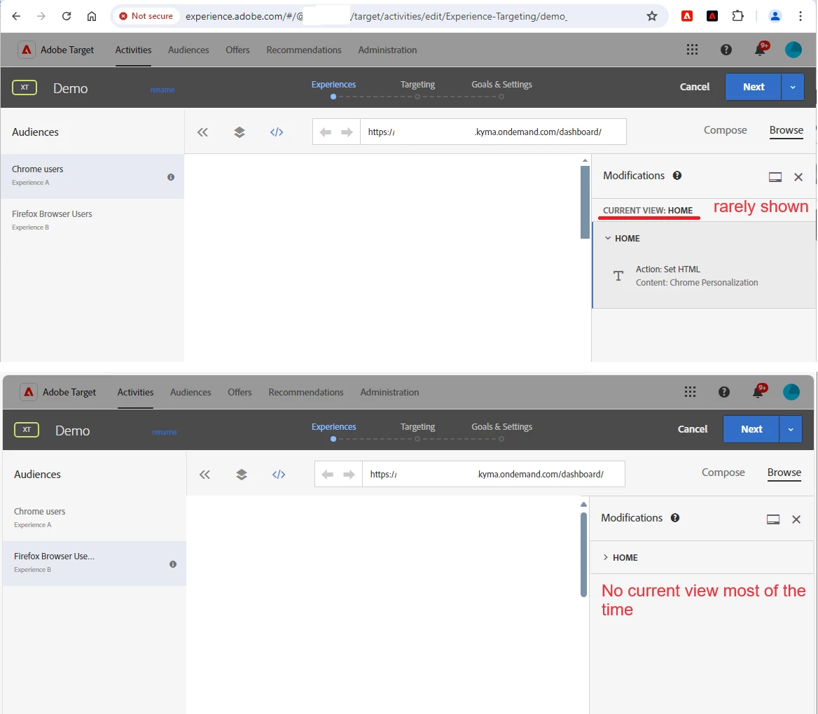 However, when I open the application in VEC, it displays the "Current view" element in about 10% of occurrences, most of the time "Current View" is not displayed.