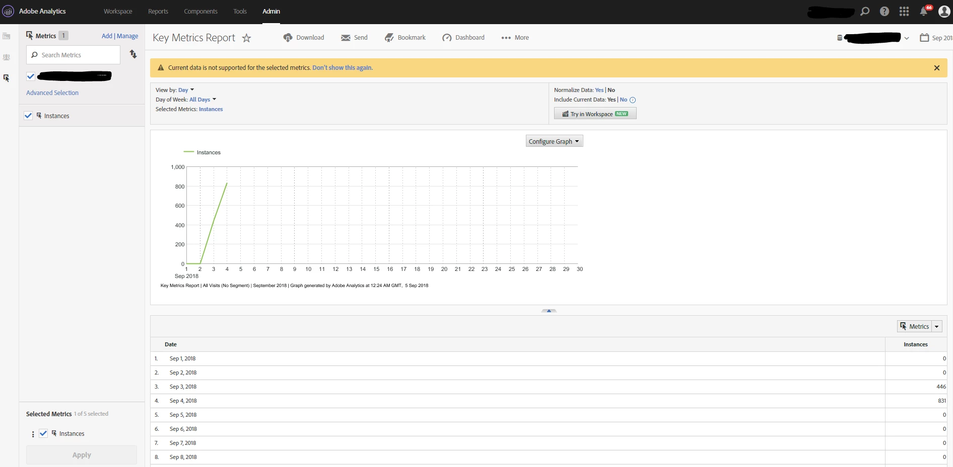 In my new report suite, there are no metrics to choose in the report builder. How do I enable them? The documentation I can find just says they should be "out of the box" but that doesn't seem to be the case. I've installed DTM and it is clearly sending something to Analytics but it's only instances. Here's a screenshot: