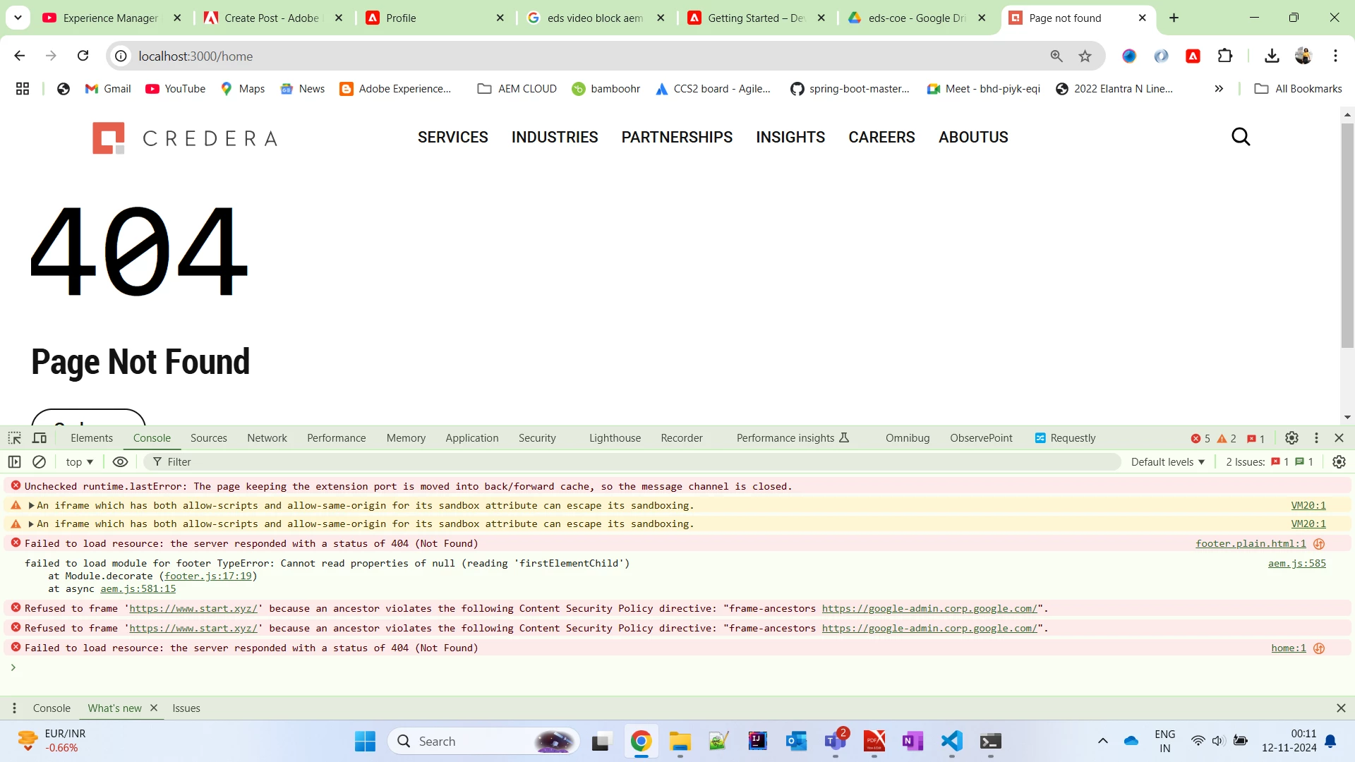 In my google drive, i have created one home page (google doc with just some texts) parallel to index, nav and footer page, but when i am trying to preview that home page it is rendering fine in main-eds link but upon hitting http://localhost:3000/home, header is loading fine and below i am getting 404 and footer is also not loading in homepage.
