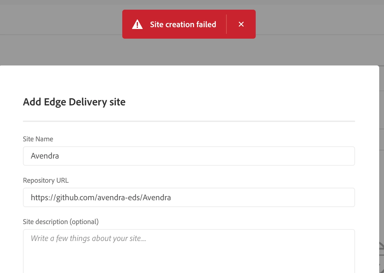 Im following the "Edge Delivery To-Do List" on Adobe Cloud within our program, and got to step 3 which is "Add Edge Delivery site". I filled out the information for that step correctly, for our teams github repo for this site and the clients name - but facing a "Site creation failed" error. (See attached screenshot)