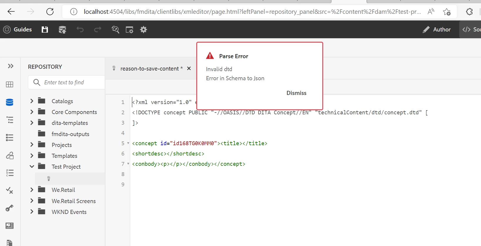 I am using AEM service Pack 13 with Adobe Experience Manager Guides 4.1. I tried creating a new topic and got the following error. How to resolve this issue ?