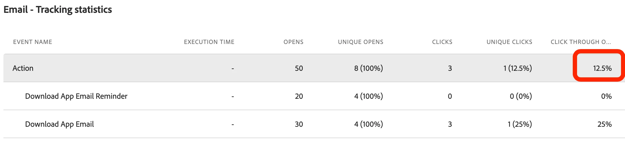 @vidushi87, This will be formula used "Total number of clicks in a delivery compared to the number of delivered messages". You can see below total 8 sent. Out of 8 from two deliveries total of 1 unique click which is 12.5%.