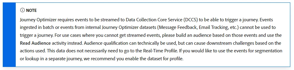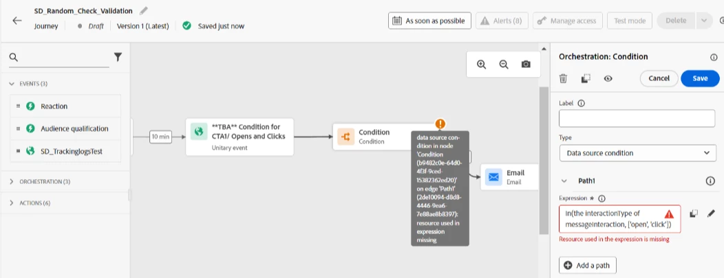 From the below SS, we tried to create an event with "AJO Email Tracking Experience Event Schema" to read Click/Open Tracking. Same event has been used in the journey and then we have condition activity after the events. This Conditions activity is used to split records based on Clicks and open. but we are getting the error as "resource used in this expression is missing".