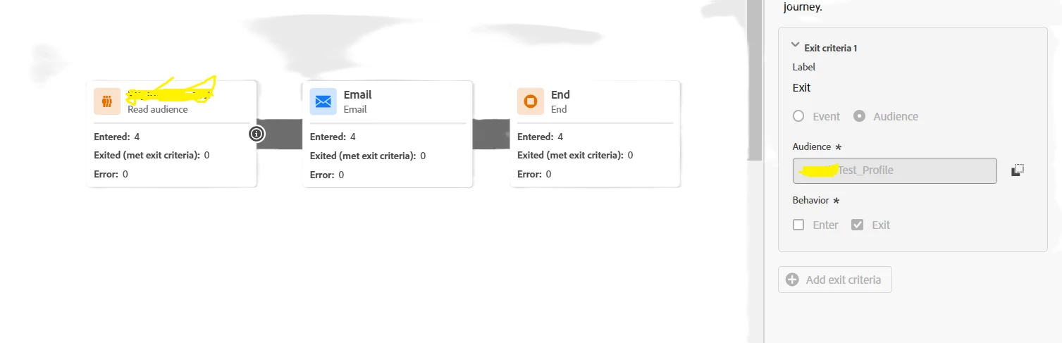 While testing, I created a "Read" audience, added the 4-person segment (including my profile), and set exit criteria to exclude my profile. After activating the journey, the email was only sent to the remaining three people. However, I still received the email as well, despite my profile being included in the exit criteria.