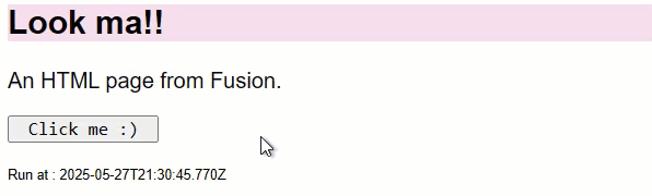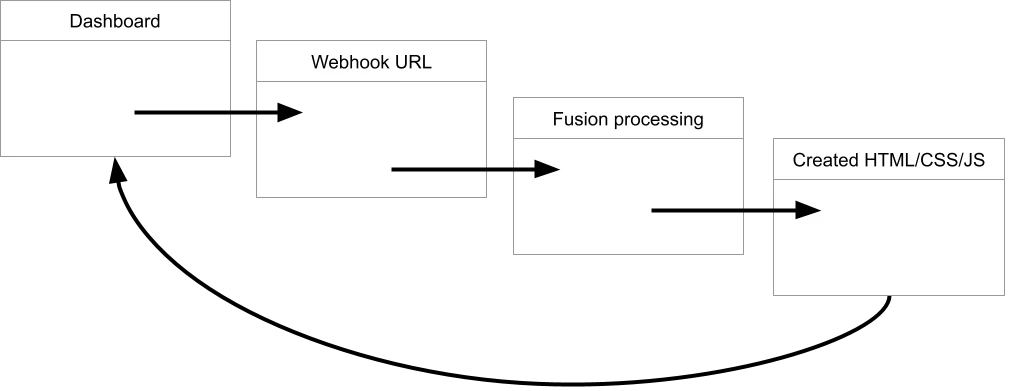 A dashboard can be populated with an "external page" that is, any URL that allows itself to be i-framed. Here we use Fusion's webhook URL. As soon as the page loads, the webhook is called, Fusion does its thing, produces output and sends it back. The browser then displays that page.