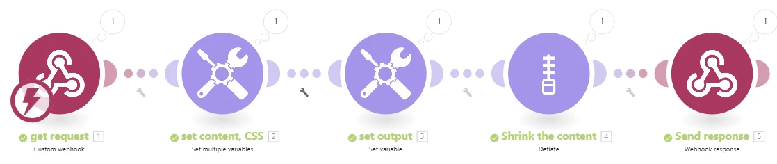 Finally, the webhook response module. Without it, the scenario will just return the text "Accepted" immediately after it gets the request. Using this module keeps the connection open, meaning the browser waits for a proper response.