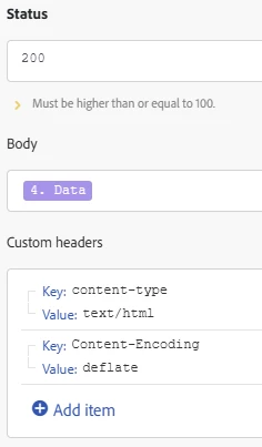 The status = 200 to tell the browser all is well (i.e., no error); the body is the populated value of the "set output" module. The headers let the browser know exactly what we're sending: The response is an HTML document that was compressed.
