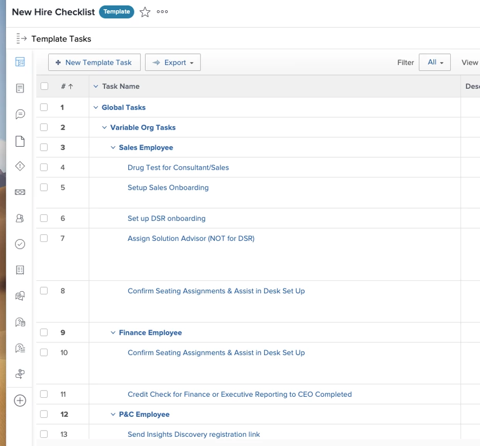 As soon as a candidate accepts a job offer, a New Hire Checklist project is kicked off. Tasks such as their seating assignment, desk setup, access badge, parking access, software and hardware setup, systems access, and and welcome box shipment are on the list. It also includes tasks specific to their department.