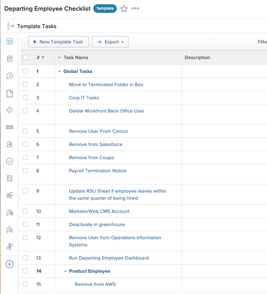 Of course, all good things come to an end. Workfront has made it easy to track departing employees exit tasks as well. This ensures that the company is protected and the employee has a smooth transition as they move to a new opportunity.