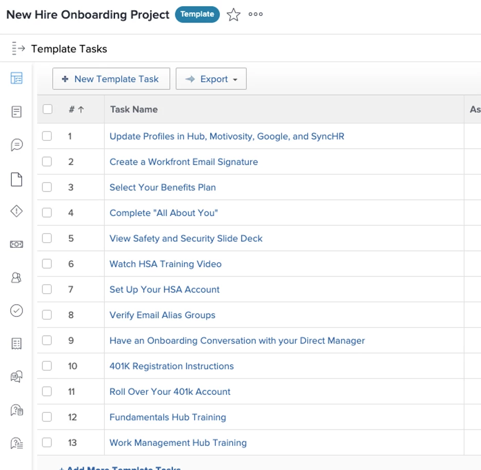 On day 1, the new employee is assigned a New Hire Onboarding project. This project includes everything a new employee needs to know and do in their first 2 weeks on the job. This includes benefits paperwork, software training, profile setup and of course banking information (so they can get paid).