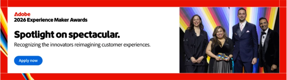 Submissions are open for the 2026 Adobe Experience Maker Awards. Each company can apply in up to three of ten categories, including The Groundbreaker— a new award celebrating individuals or teams laying the foundation for increasingly personalized experiences, and The Conductor, which recognizes companies accelerating time-to-market by streamlining content creation and delivery workflows with Adobe Workfront and Adobe Experience Manager.