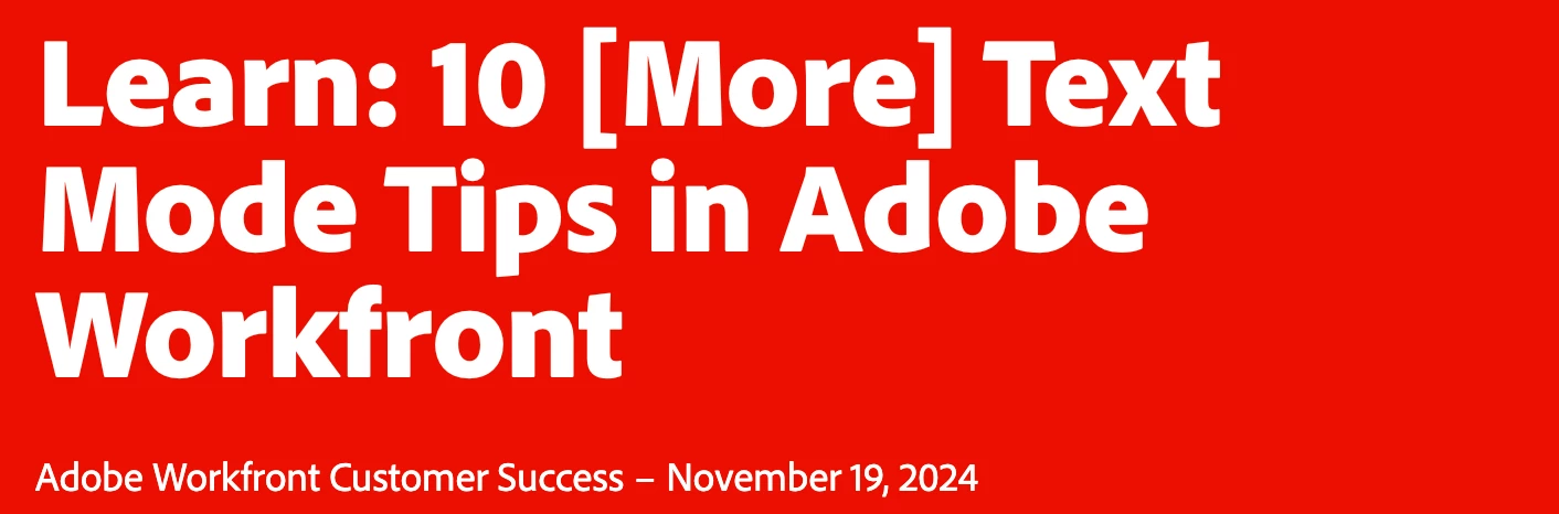 Thank you to everyone who joined, asked questions, and shared additional pointers in today's workshop, 10 [More] Text Mode Tips in Adobe Workfront! This session was a continuation of the original, 10 Text Mode Tips workshop done in April, so if you're looking for additional examples, check out that post.
