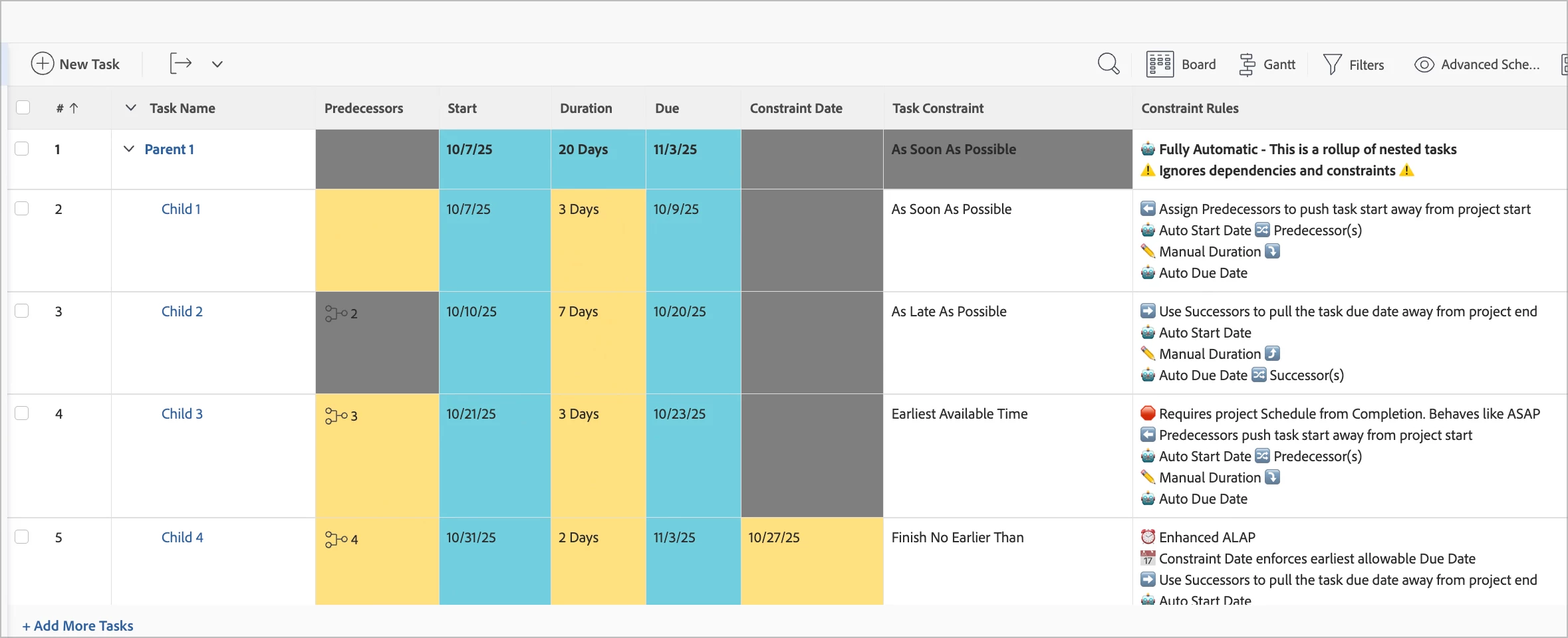 The view includes Predecessor, Start, Duration, End, and Task Constraint columns that each use conditional formatting to highlight cells the cells in which the user is expected to provide input (yellow for "pencil" vs. aqua for "auto/robot".) Cells that appear in grey indicate cells in which the user cannot input, or that their input will be ignored. The real value comes in the Constraint Rules column. This is a calculated column that displays the rules that Workfront follows when setting task dates, based on the selected Task Constraint. As you update the task constraint, you will see not only the cell colors change, but also the a breakdown of rules that will now govern the task dates. It informs when a date is tied to connected dependencies, or is manually set by the user, or is simply calculated. Each constraint explains rules for Start, Duration, and Due Date in that order, with additional rules that may apply to that specific constraint. There's also some helper text in the column descriptions.