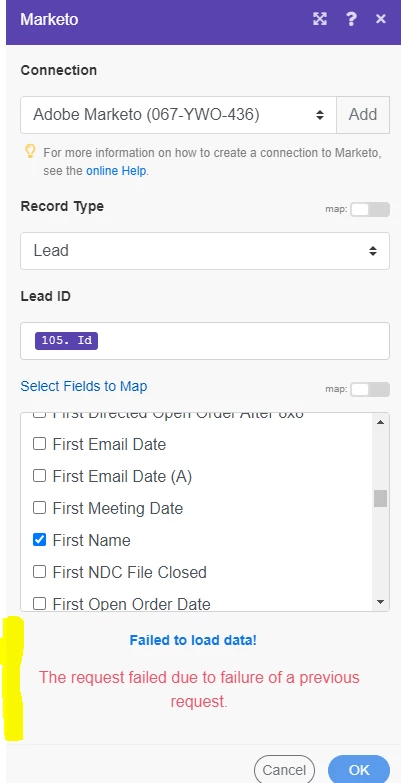 Select Field to Map: prompts the error "Failed to load data! The request failed due to failure of a previous request."