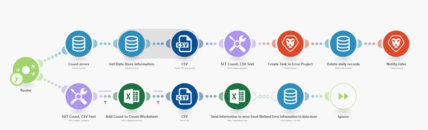 I also want to extend the error handling scenario I built for everyone's automations. I have data store modules attached to Ignore error handlers at known chokepoints in scenarios. All that information ends up in a data store. The scenario reads the data store at 5 p.m., counts the errors, adds the information into a lookup project (for reporting purposes), collects all the info into a temp CSV, takes the info and stores it into an Excel spreadsheet, zaps the data store, and emails me to let me know how many times Fusion errored out. I used an Excel sheet because of data store limitations.