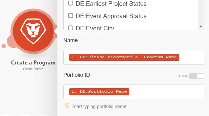 Under the Create a Record - Program module, I mapped the field of Portfolio ID with the typehead field of Portfolio entered by the requestor when they submit the request: