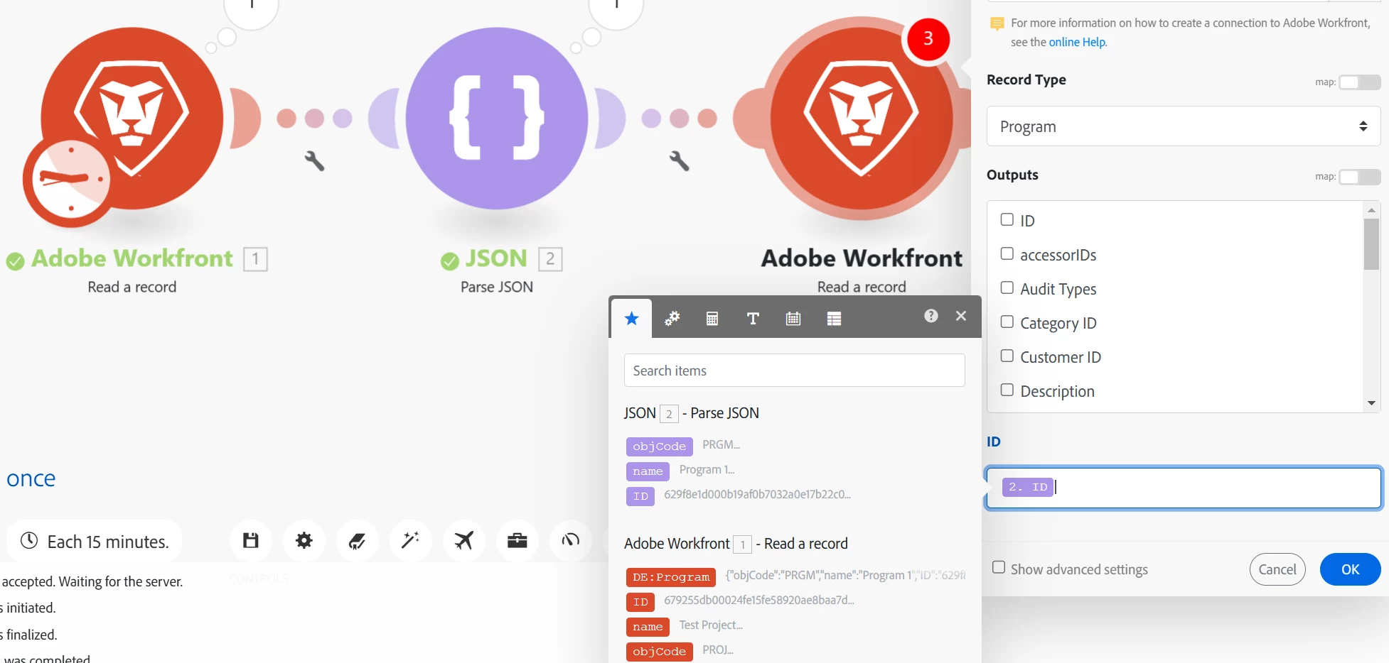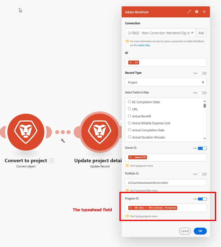 Now the challenge is that in Fusion, the program is identified by an ID in the "Update record" (screenshot below), and I'm struggling to retrieve the corresponding program ID based on the program name entered in the typeahead field. I need to map that ID in Fusion.