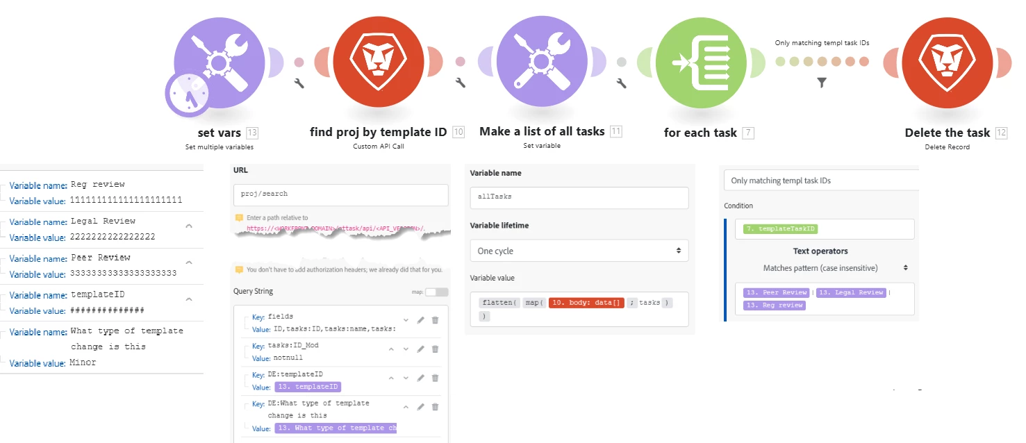 I am working on a project to remove three tasks based on a selection option on the project. if the selection is "What type of template change is this?" = "Minor" then three tasks are to be removed from the project. So when the user creates this project and selects that choice then fusion removes three tasks from the project. "Reg review, Legal Review, Peer Review". I started with a search module looking for projects created with a specific template, then used a read module to gather the data, then i need to point to the choice on the project. i'm thinking i may need a switch module for the choice. Any help would be appreciated.