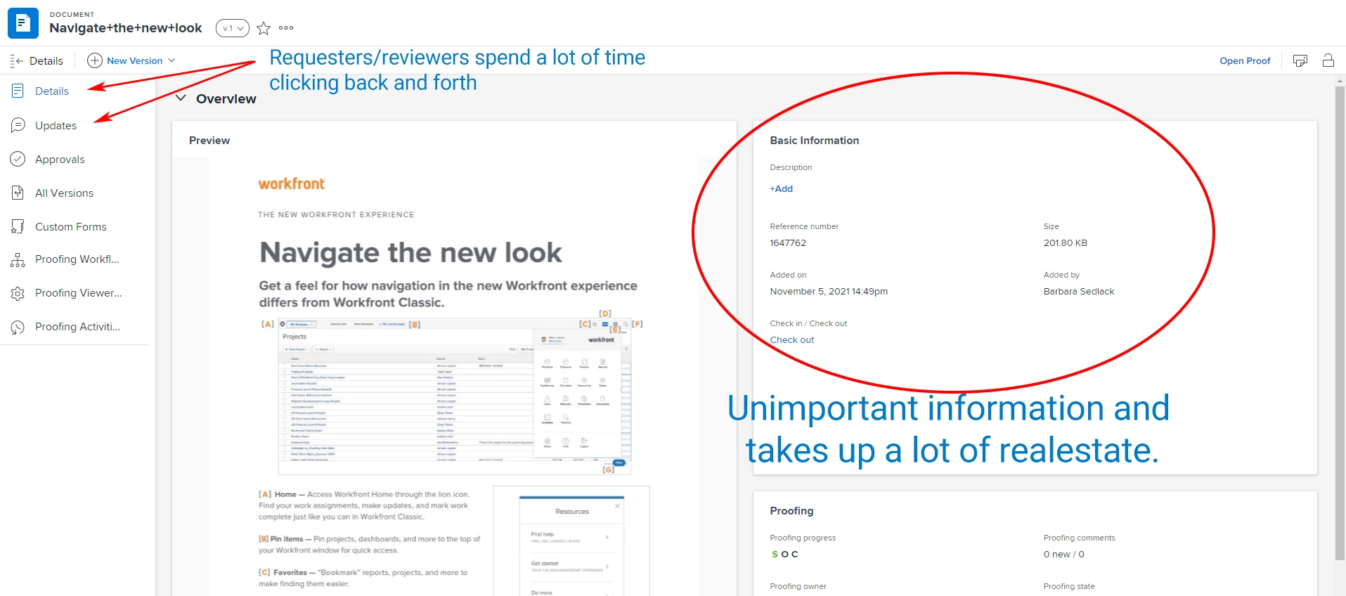 Users express frustration that you have to click between the Details page and the Updates page when working with a Document. The Details page shows them a great thumbnail of the document but then they need to click away from that in order to post an Update or reply to an Update.