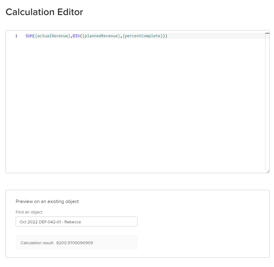 I'm trying to create a custom calculated field that adds actual task revenue against upcoming planned revenue. However I want to add in specific formulae that calculate planned revenue remaining against the percentage complete.