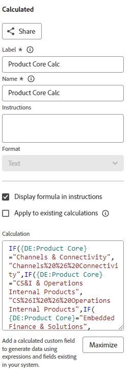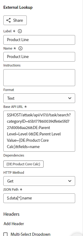 Finally, I created the Product Line field which took the selection from the first field (but was manipulated by the calc field) to show only Product Line items related to the Core product that was selected.  Note the API call and dependency is using the calc field I created above so it can be understood and pull the right info.  Hope this helps, it was a challenge for our side as well.