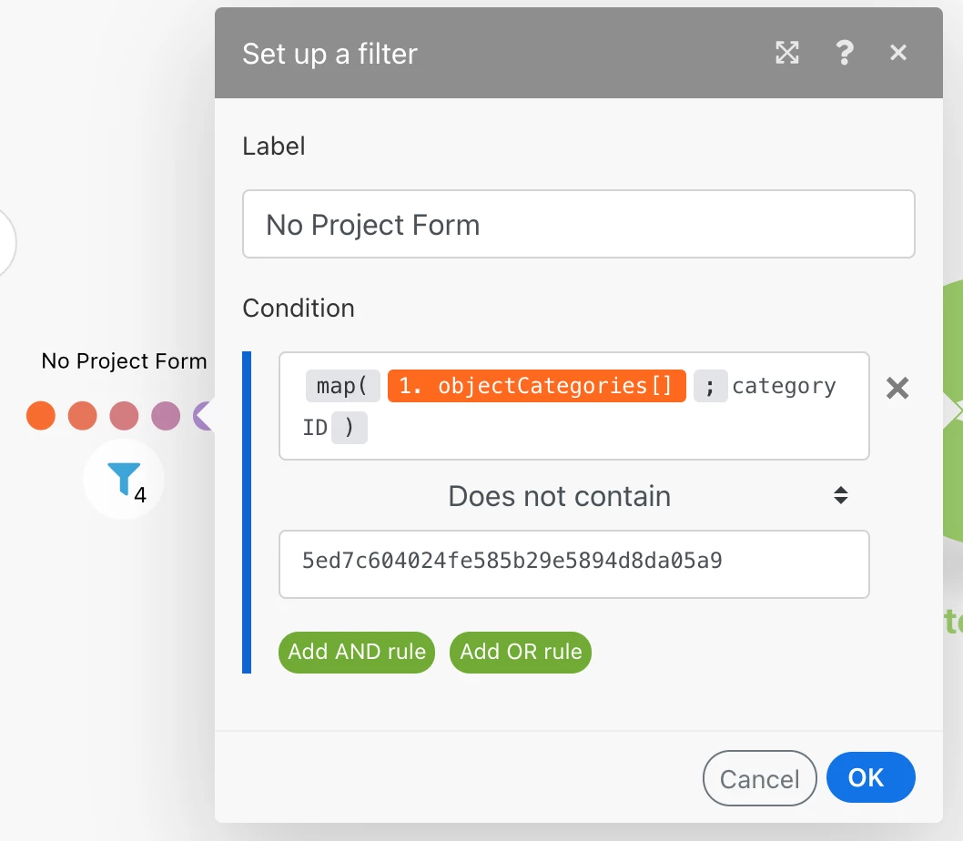 I'm creating an automation to add a specific project form to any project that doesn't already have it. I have a search module that searches all active projects and returns: