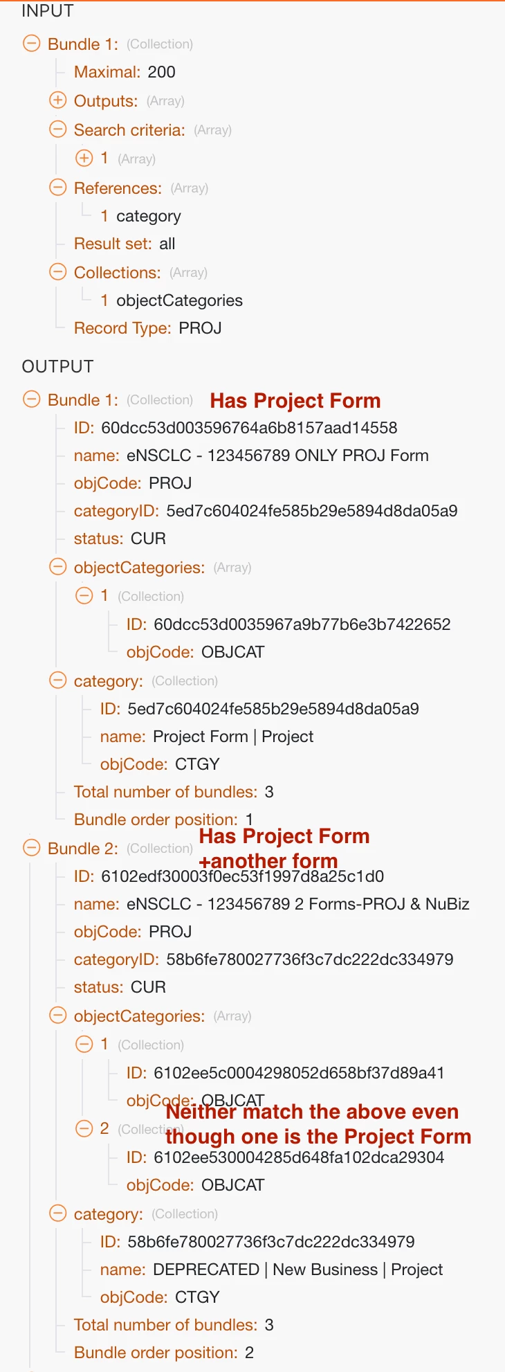 In the return bundle, everything makes sense except the objectCategories. There are 2 and neither are the form listed in the CategoryID section. In fact, I can't find these IDs anywhere. What are they, where did they come from? None of my forms of any kind have these IDs.