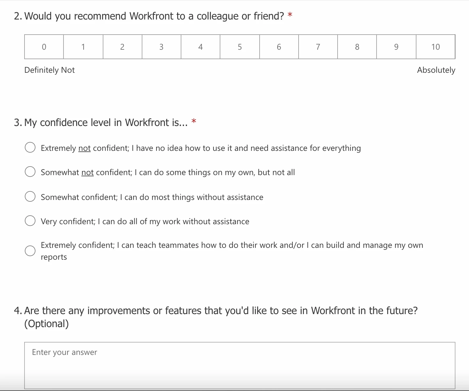 - We had a question "Would you recommend Workfront to a colleague or friend?" and it generated a pretty low NPS, which was extremely shocking to us. If you had a similar NPS question on your survey, what was your score? Were you able to increase that over time? If so, how?