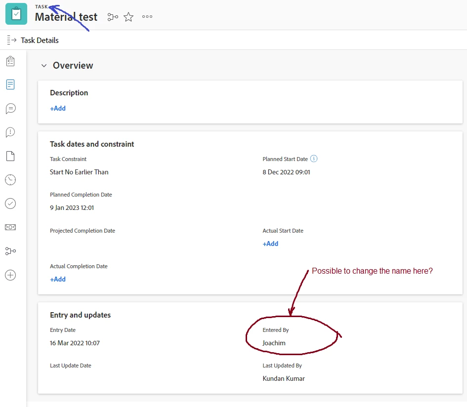 Is it possible to Change the user name in "Entered By" for a task? Any way to do that?