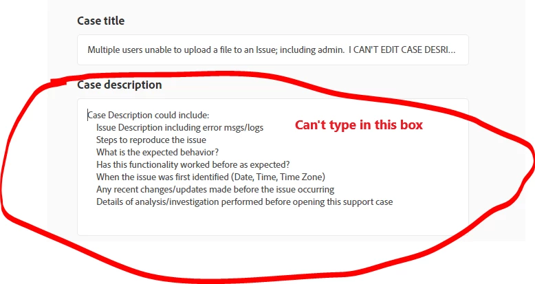 I am trying to submit a support ticket, but can't as the Case Description field won't let me enter text. And I can't submit w/o filling in the field. And I can't submit a ticket to report the issue with submitting a support ticket, because that would require me to enter a Case Description. Catch-22, so that's why I'm here.