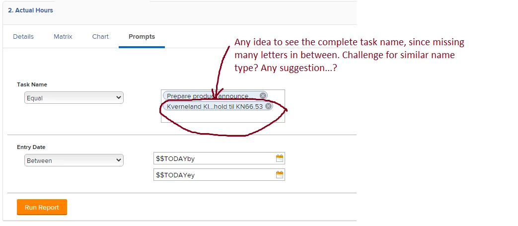 Any idea to see the complete task name in text box in a report prompt, since missing many letters in between. Challenge for similar name type? Any suggestion...?