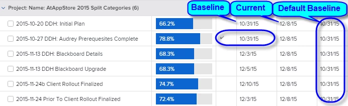 Project baseline report that shows specific baselines + the default baseline