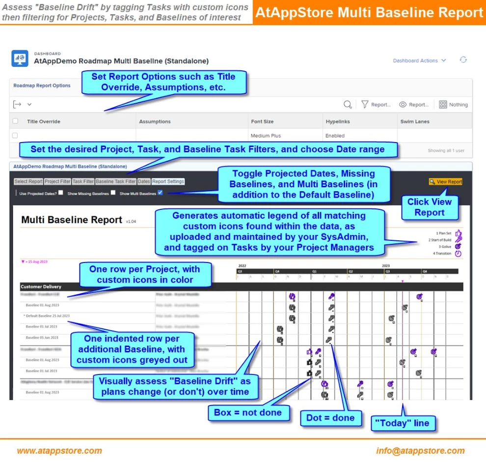 I'm trying to produce a project baseline report that shows any baselines where the name contains "extended" in it. In addition to showing these baselines, grouped by project, I also want to surface the Planned Completion Date for the baseline under each project that is marked as the default baseline.