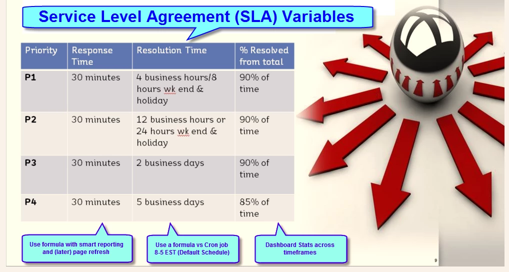 The graphic below illustrates the P1-P4 Response Time, Resolution Time, and % Compliance requirements from an SLA solution I solved using native Workfront (only) several years ago.
