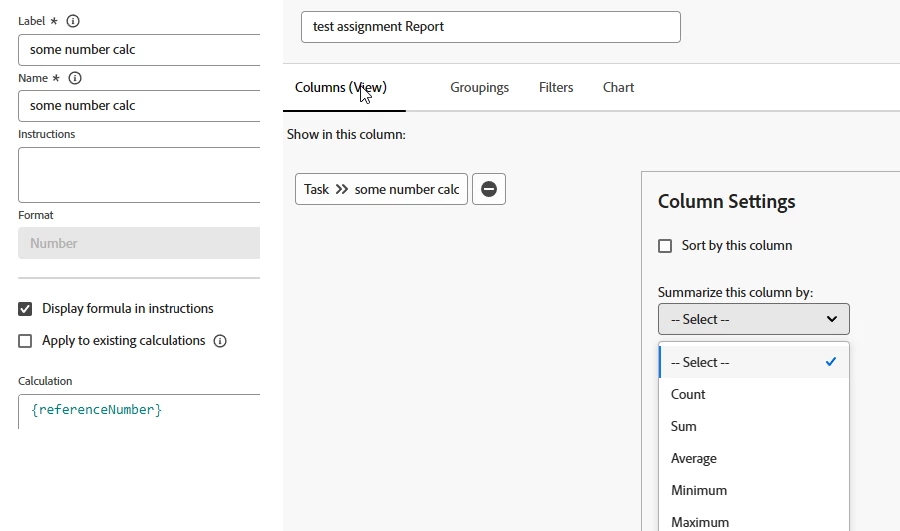 I am attempting to summarize a calculated field that is found on the Task level. My calculated field is formatted as a Number.